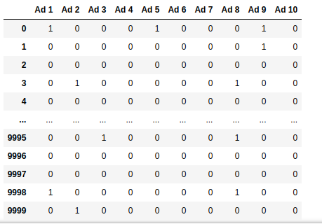 The dataset is a matrix with $10,000$ rows and $10$ columns. Each row represents a request made to an online ad server to display an advertisement. The ad server has a catalog of $10$ ads: ${Ad_1, \ldots, Ad_{10}}$. The value in cell $(i, j)$ is 1 if and only if ad $Ad_j$ would be clicked when displayed to a user visiting the website; otherwise, the value is 0. Importantly, this information is unknown to the ad server at the time of ad selection.